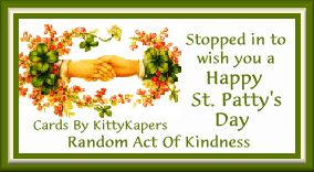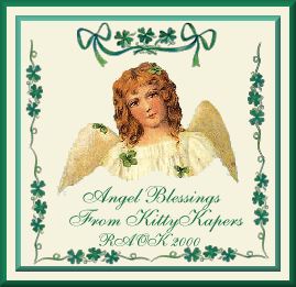 IRISH BLESSING May the road rise up to meet you.May the wind be always at your back,the sun shine warm upon your face,the rain fall soft upon your field,and until we meet again, may Godhold you int he hollow of His hand. St. Patrick's Day is celebrated on March 17th. It honors Saint Patrick who is the patron Saint of Ireland. It is also a celebration of Irish culture. There are usually parades, food, music and dancing. All in all, it is a fun day to celebrate. AMERICAN CUSTOMS Americans of Irish descent outnumber the Irish in Ireland. Mass is attended in the morning of Saint Patrick's Day. There is an afternoon parade in larger cities. The first parade was in Boston in 1737. People will celebrate in their homes, pubs or restaurants Leprechaun and three leaf clover decorations are displayed. Many (Irish or not) wear green to keep from getting pinched. Greeting cards and green decorations are sold in stores. Green cupcates are made or sold in stores for St. Paddy's Day parties. Mint milkshakes called Shamrock shakes are available at fast-food restaurants. Did you really think you would get away with not seeing a kitty cat on my pages?????? Introducing "Erin" my St. Paddy's guardian kitty. Before you go on to my next page, here is an Irish Angel gift I made for you. Take it if you want to. Here is a little card for RAOK members to place in guestbooks. Retired Guestbook Animations from:IBAN ClipartAnimated Gif Archive Midi from:Celtic Music FastCounter by bcentral
